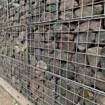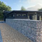 External landscaping includes gabion baskets (metal cages filled with stone) to create a feature wall that will be softened with planting over time. Large decorative slabs make up the entrance and patio, including a walkover water feature and raised planters, complimenting the architectural features.