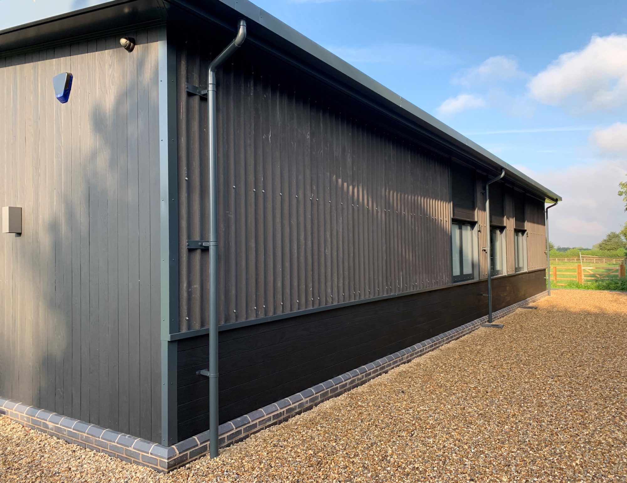 Taking inspiration from the original barn we wanted to replicate the corrugated metal frame and have used Marley Farmscape roofing and elevations. Charred timber cladding brings a striking look, the burnt surface offers the timber cladding a natural protection against insects, mould and weathering! Powder coated guttering, downspouts and flashings in dark anthracite complete the look.