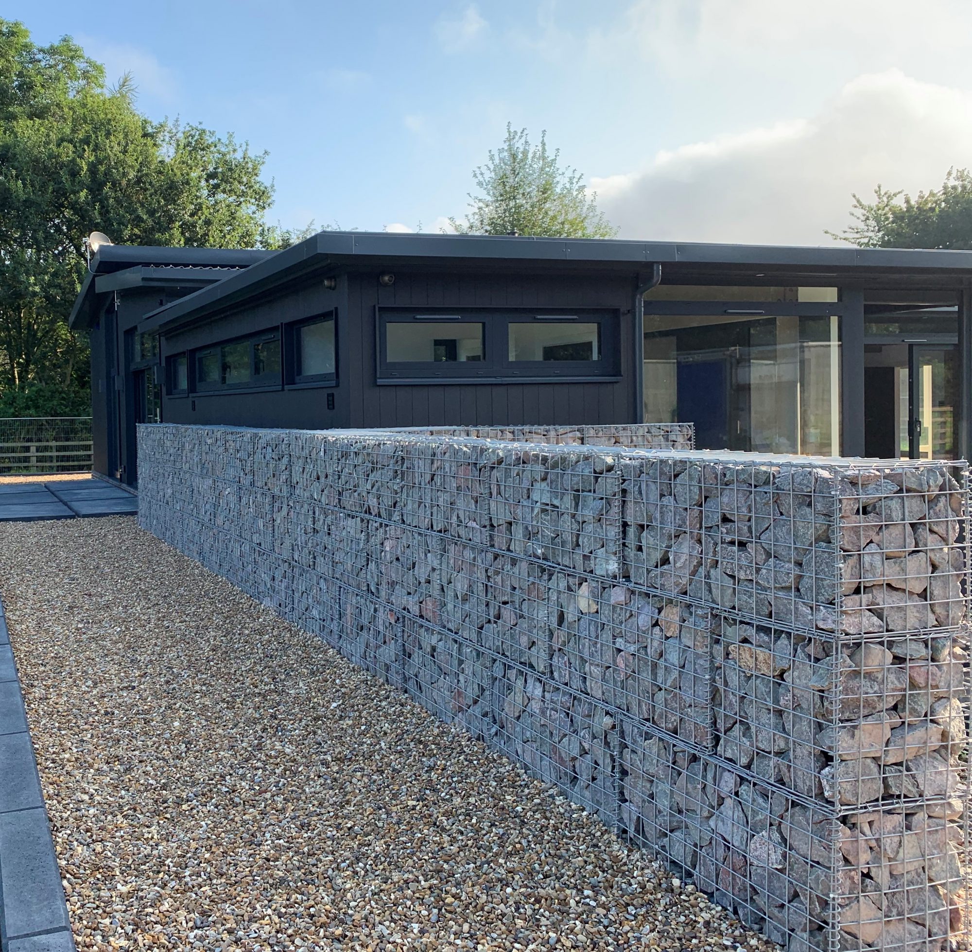 External landscaping includes gabion baskets (metal cages filled with stone) to create a feature wall that will be softened with planting over time. Large decorative slabs make up the entrance and patio, including a walkover water feature and raised planters, complimenting the architectural features.